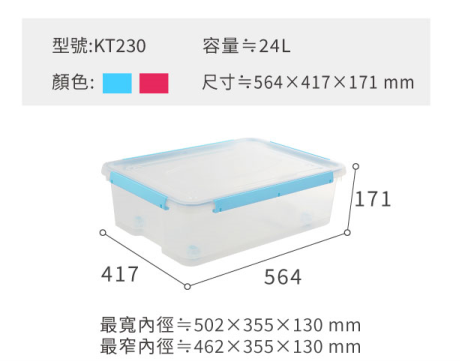蓋內高級矽膠條,四面環扣設計,使闔蓋更密封,可防水、防潮、防塵、防蟲,底部蜂窩結構設計,更為穩固耐用;底部滑輪設計,可拆裝變換方向,移動更方便,透明外型,易於檢視內容物,清楚分類,可作堆疊放置,亦可層層堆疊收納,節省空間,有五種款式,可供選擇。