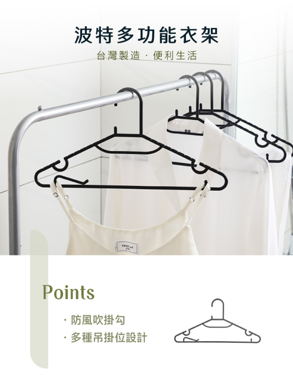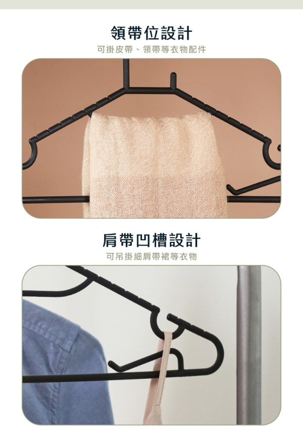 低調時尚的黑色色調,特殊掛勾設計,可防風吹落,貼心的領帶位、凹槽之設計,可吊掛領帶、絲巾、皮帶、細肩帶衣裙等,貼心的固定夾設計,可固定毛巾、方巾、圍巾、衣物等不脫落。