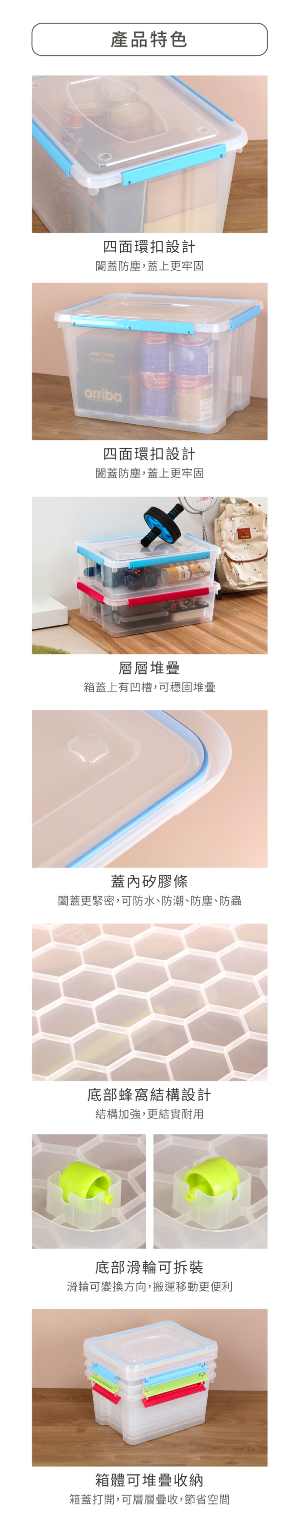 台灣製最大保鮮盒,蓋內高級矽膠條,四面環扣設計,使闔蓋更密封,可防水、防潮、防塵、防蟲,底部蜂窩結構設計,更為穩固耐用;底部滑輪設計,可拆裝變換方向,移動更方便,透明外型,易於檢視內容物,清楚分類,可作堆疊放置,亦可層層堆疊收納,節省空間,有五種款式,可供選擇。