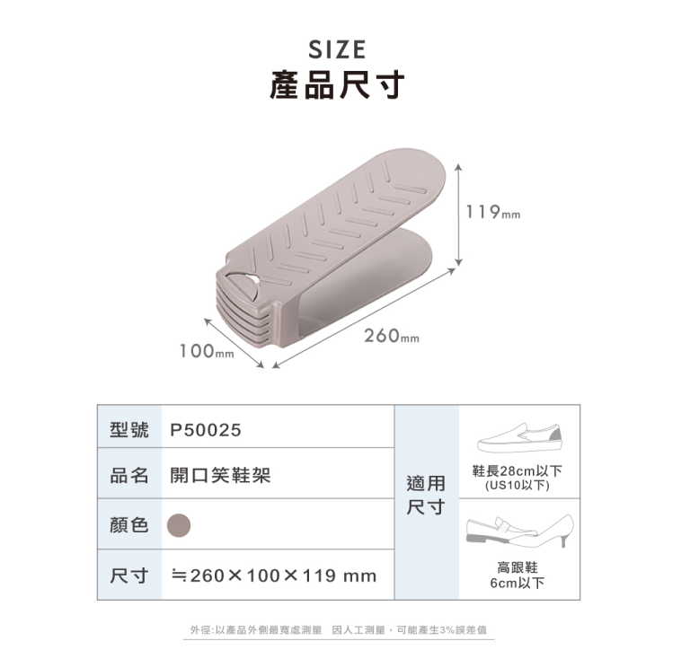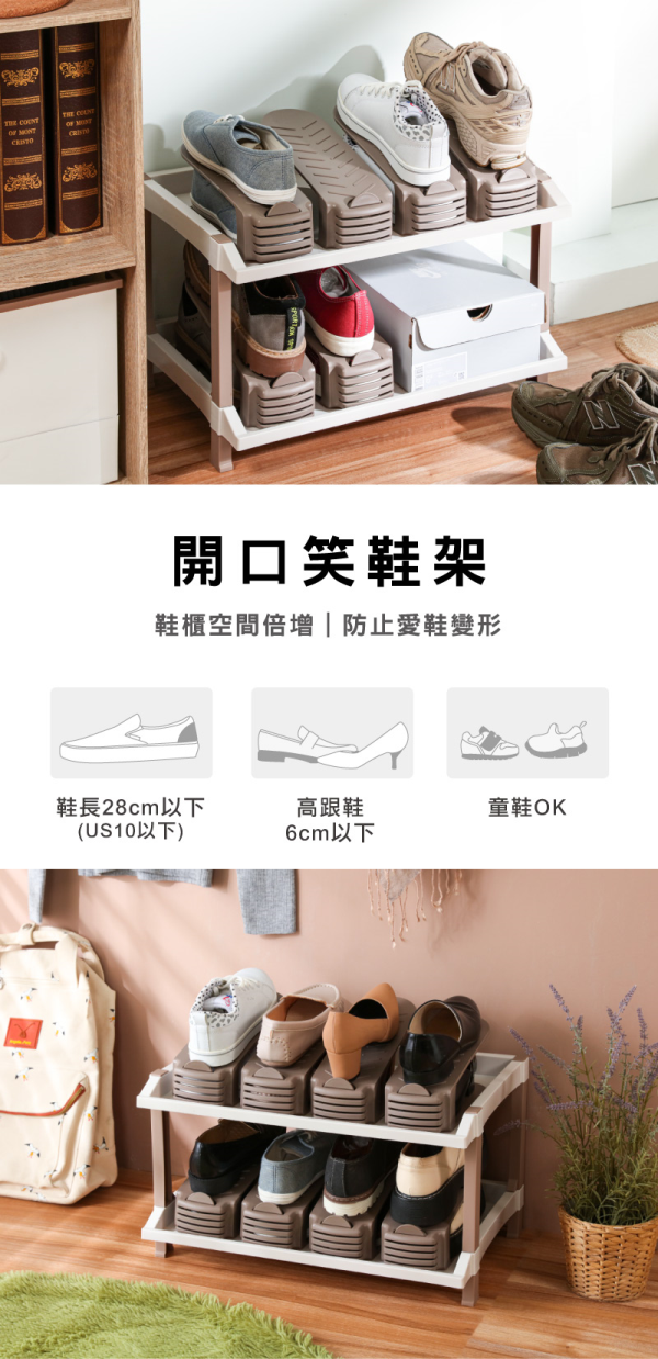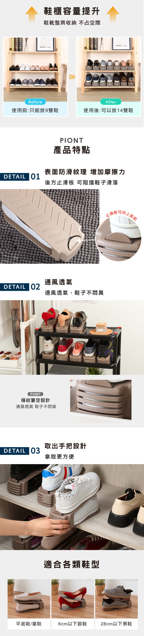 鞋櫃空間倍增,真誠沉穩的灰色色調,防止愛鞋變形,後方止滑板,可往上板起,配合表面凸部設計,防止鞋子滑落;男女鞋適用,適用於6CM以下之高跟鞋,注意:過高鞋跟會讓鞋架離地,放不進去。