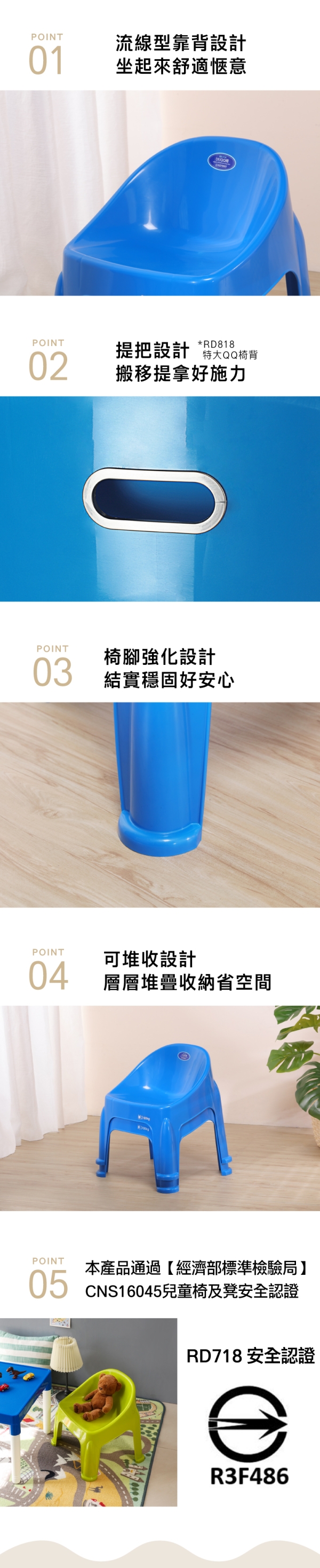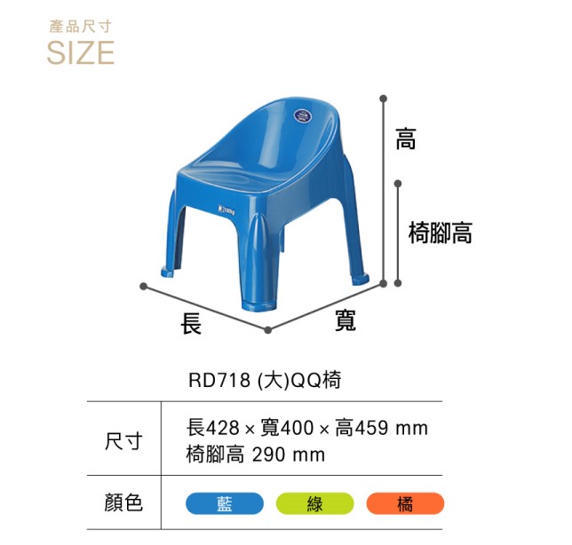 流線型靠背設計,符合人體工學,坐起來舒適愜意,椅腳強化設計,更為結實穩固;特大QQ椅(RD818)椅背作手把設計,便於拿取移動,亦可層層堆疊收納,節省空間。RD718通過【經濟部標準檢驗局】CNS16045兒童椅及凳的安全認證
