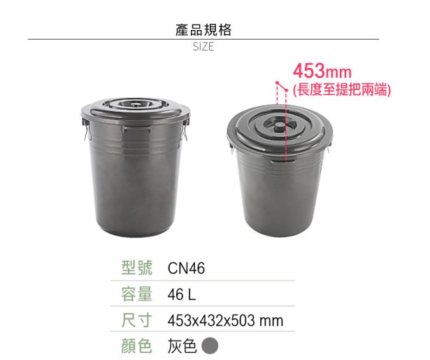 沉穩低調的灰色色調,桶蓋防異味,側邊凸槽、側邊提把,便於提拿,有四種尺寸,可供選擇。