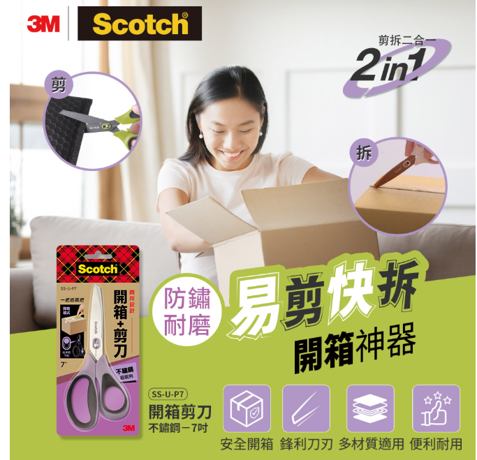◆兼具剪刀和開箱刀的功能,二合一開箱 剪刀。