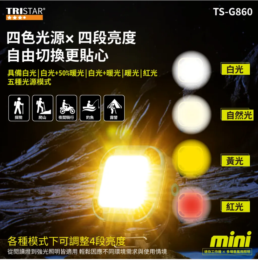 具備強光/中光/紅燈常亮/紅燈閃爍四段照明模式,滿足各種應用情境