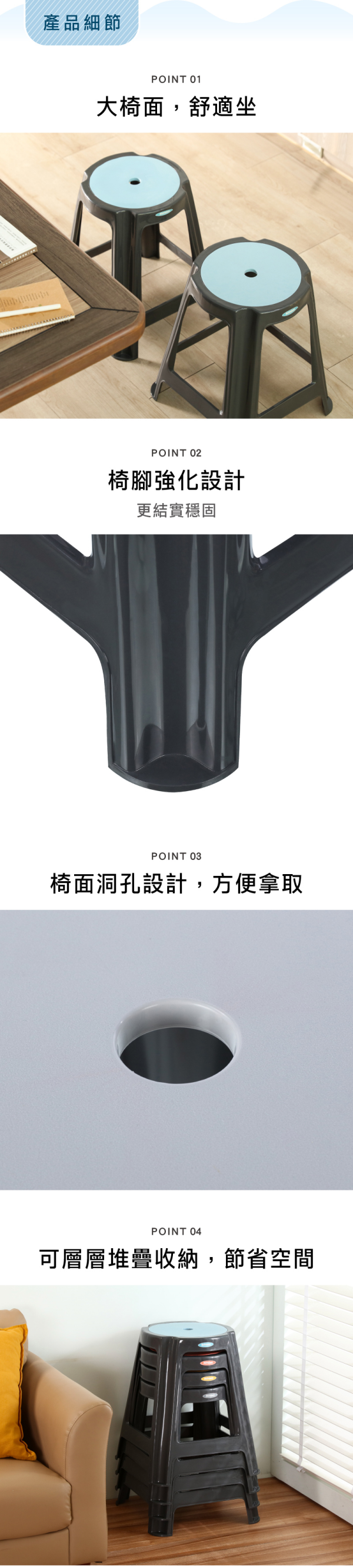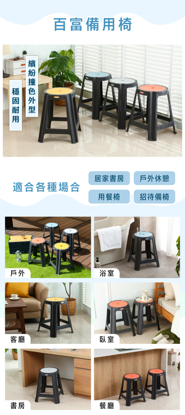 大椅面舒適好坐,椅腳結構強化,穩定堅固;椅面中間洞孔設計,方便拿取;可堆疊收納,節省空間。椅面共四種配色可供選擇。