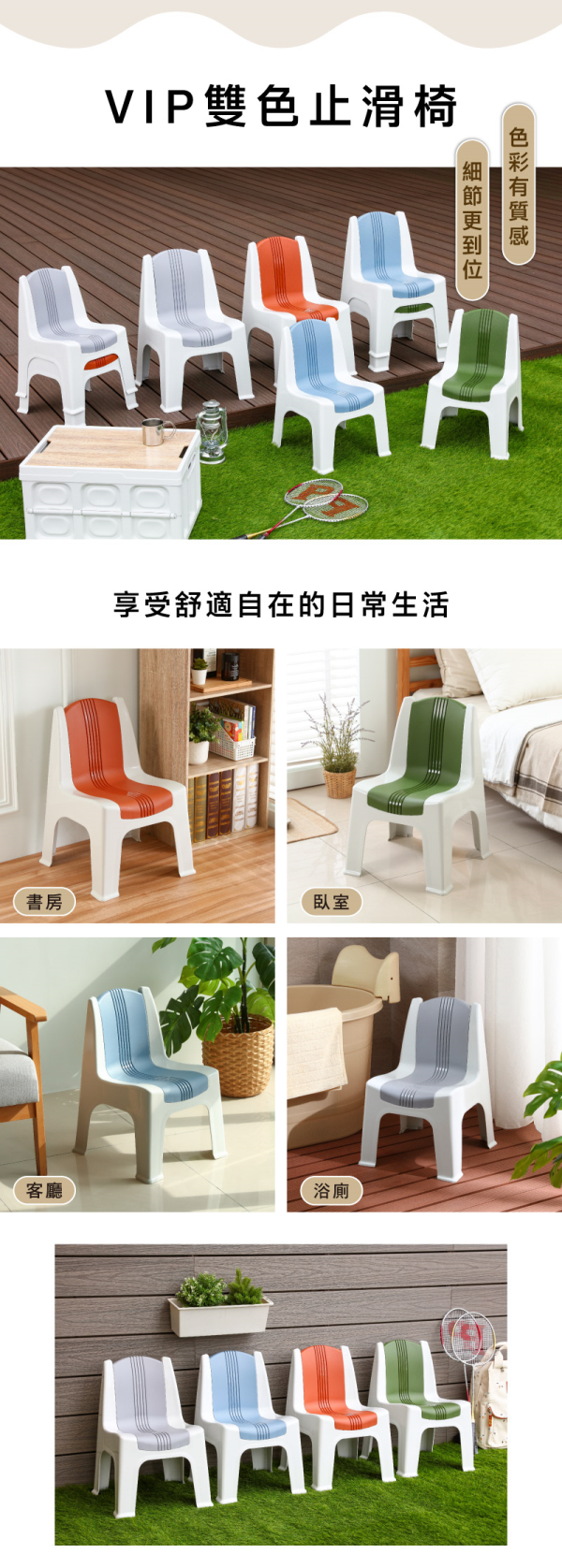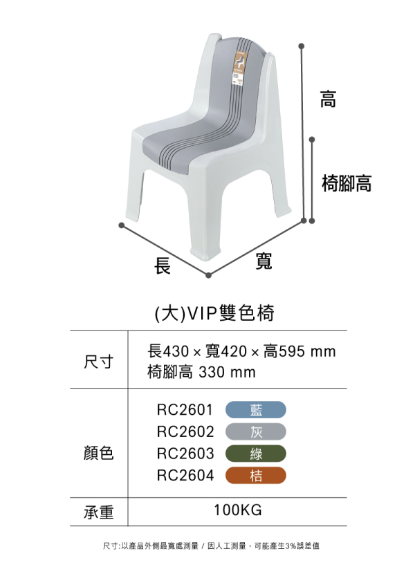 VIP 雙色椅系列提供中、大兩種尺寸4種色彩,無論居家、露營或戶外活動都能輕鬆搭配。椅面採流線弧形設計,符合人體工學,久坐也舒適不累。椅背兩側採凸起設計,可支撐背包或物品穩定放置;後側配有提把孔,拿取移動更便利,也能輕鬆堆疊收納。中款承重約 80 kg,大款承重約 100 kg,穩固耐用,是日常與外出皆適用的實用好椅。