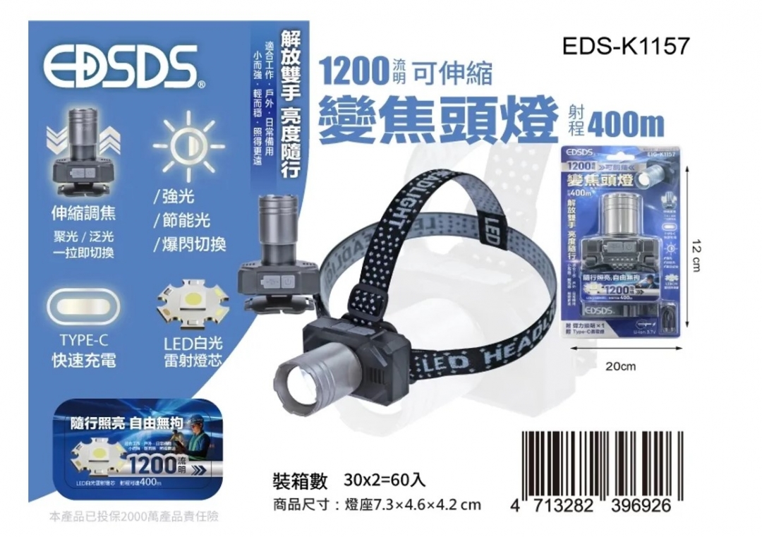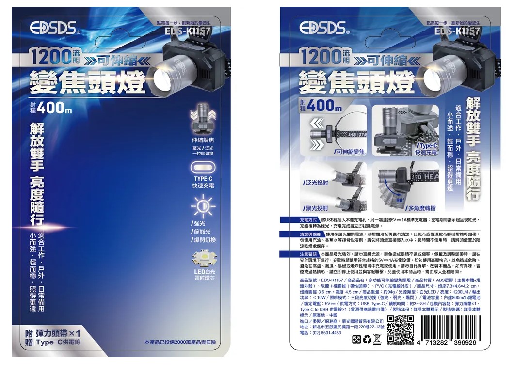 材質:ABS 塑膠(主機本體、燈頭外殼)、尼龍橡膠纖維(彈性頭帶)、PVC(電線外皮)